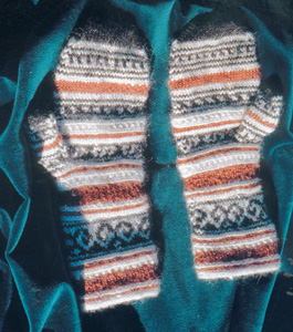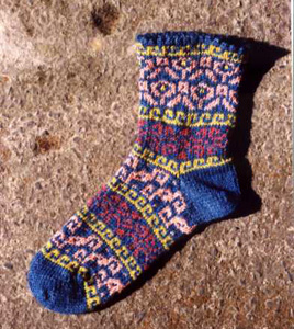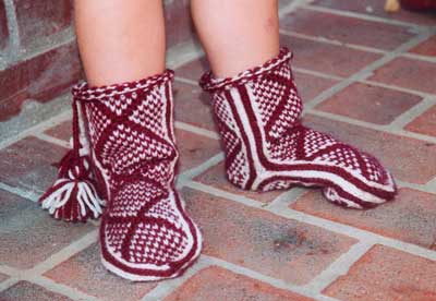 Our Afghan Mittens pattern derives from authentic gloves knitted in the Hazara tradition. For intermediate knitters, the pattern features four small charts, raised bands knit with two strands, and a short lace pattern. The pattern was documented by Judy Sours of Ferncrest Farms, which seasonally produces mohair-and-wool sportweight yarn -- visit here to inquire about their yarn. Or, substitute the sportweight yarn of your choice. The mittens use about 1-1/2 ounces of each of three colors (about 300 yards total) that may be carried on bobbins or knit in. Written for a women's medium size, gauge is 7 stitches, 9 rows = 1", using U.S. size 2 double-point needles. The palm measures about 8" around. Go up one needle size to make larger mittens for a woman or man. Afghan Socks for Children *** Afghan Socks for Children pattern now available as a PDF download through Ravelry for $7.00! Get the pattern instantly! ***