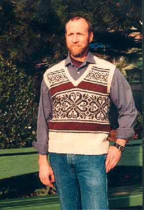 Our sweater-jacket was inspired by a photo of the Masjid-i-Jami -- or Friday Mosque -- at Herat, Afghanistan, taken by Luke Powell. The motifs and colors evoke the mosaic art that adorns this 800-year-old structure and place of worship. Our knitting pattern is a tribute to the region's rich cultural heritage and the Afghan people. As in the time-consuming handwork employed in the traditional hand-knotted Afghan wool rug, this sweater design uses fine wool yarn, detailed patternwork, and color changes that require time and care. Experienced knitters will enjoy the challenge. Suitable for girl or boy. Pattern includes 3 sizes: 12-18 months, 2 -3 years, 4 years, with finished chests of 24", 26", and 28". Our sweater was made with 5 colors of Shetland yarn. Substitute any fingering-weight yarn that knits to a gauge of 7 stitches, 7.5 rows = 1". Straight and double-point needles U.S. size 3, or size to obtain gauge. The sweater closes with a zipper. Afghan Vest for Men